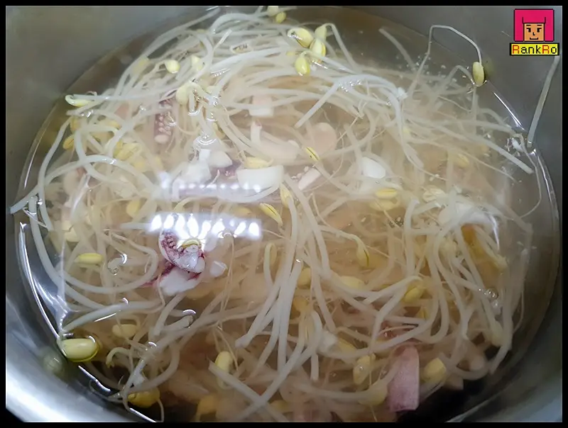 ▼ 멸치 다시마 육수에 손질해 준비한 콩나물을 넣고 강불에 끓여 주세요. 오징어 데친 물을 사용해도 좋지만 오징어의 진한 국물맛을 좋아하지 않아 멸치 다시마육수만 사용했어요.