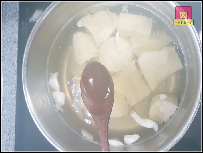 ▼ 육수가 만들어지는 동안 '맑은 순두부국'에 사용될 오늘의 주인공, 순두부는 따로 그릇에 담아놓고, 다른 그릇에는 계란2개를 풀어준 후, 파와 마늘을 각각 준비해 주었어요.