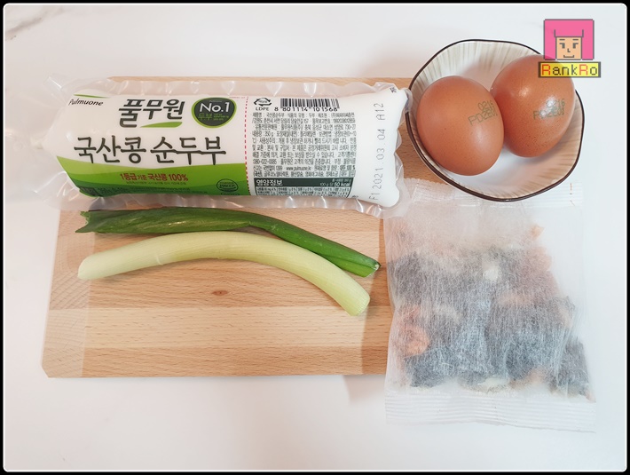 순두부 1팩, 계란2개, 파, 멸치다시팩(육수), 간장1스푼, 마늘1/2스푼, (새우젓or소금or액젓)