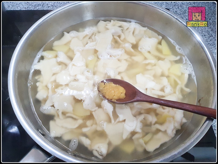 ▼ 냉장고에 있던 반죽을 떼어 넣어주시고 마늘 1/2스푼을 넣어주세요. 수제비 떠 넣는게 힘들때는 칼국수 반죽처럼 조금씩 밀대로 밀어 반죽을 펴서 떠 넣으면 좀 더 편하게 만드실 수 있답니다.