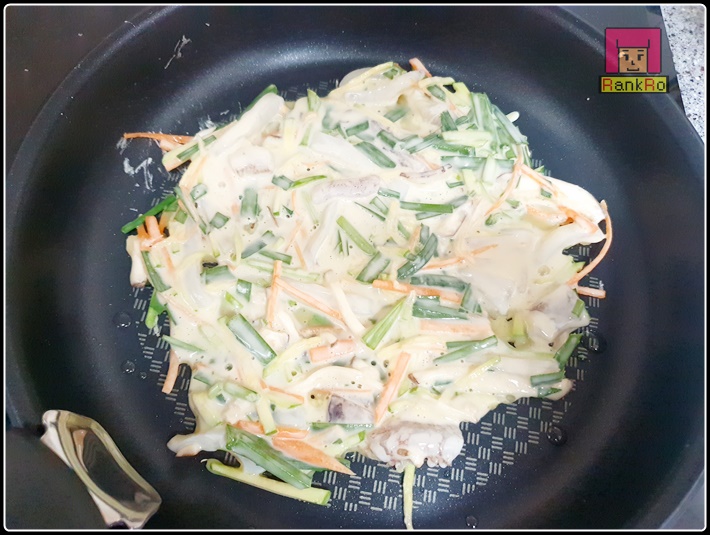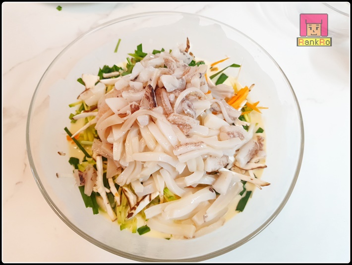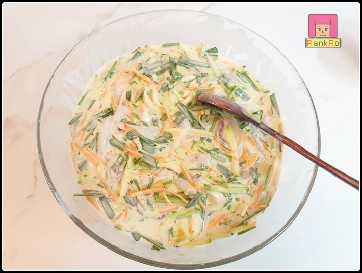 ▼ 만들어논 반죽에 오징어와 야채를 넣고 잘 섞어주세요.