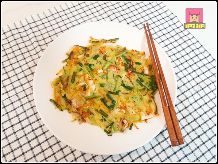 오징어 1마리, 부추한줌, 당근1/2, 호박1.2, 표고버섯3~4개, 부침가루2컵, 계란1개, 물2컵, 식용류
