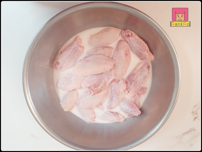 ▼ 우선 준비된 닭을 우유에 담가 10~30분정도 재우는 과정을 합니다. 닭의 잡내 제거를 위해 우유에 담가서 냉장고에 넣어 주세요. (우유에 재우는 과정을 생략해도 되지만, 닭 특유의 잡내가 조금 남을 수 있어요.)