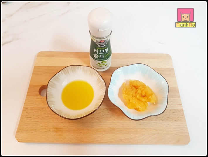 ▼ 에어프라이어 닭구이에 들어가는 올리브오일 1스푼과, 다진마늘 2스푼, 허브맛솔트를 준비합니다. (올리브 오일이 없다면 그냥 빼고 준비하셔도 됩니다. )