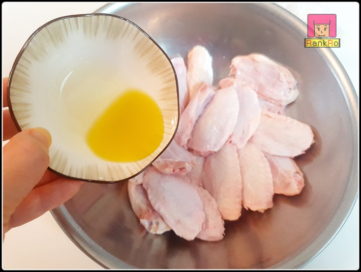▼ 준비된 닭에 올리브오일 1스푼을 넣어 주세요. (조물조물)