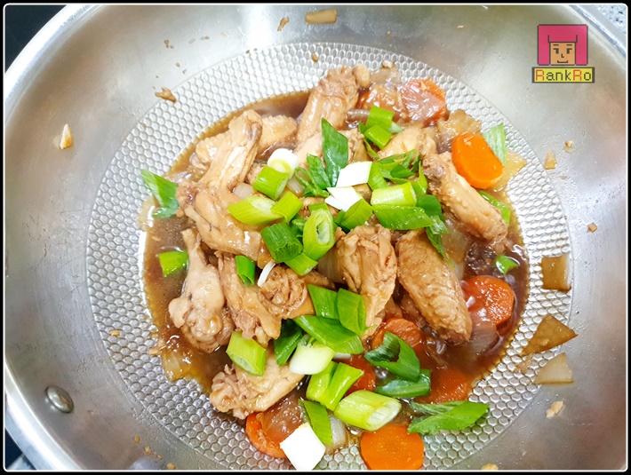 ▼ 위 재료들이 다 익고 맛이 들었다면 대파를 넣어주세요. (간을 보고 싱겁거나 단맛이 좀 더 필요하다면 모자라는 간을 맞춰주세요.) 참기름을 가미하면 닭봉간장조림, 간장닭찜에 고소한 맛이 더해집니다.