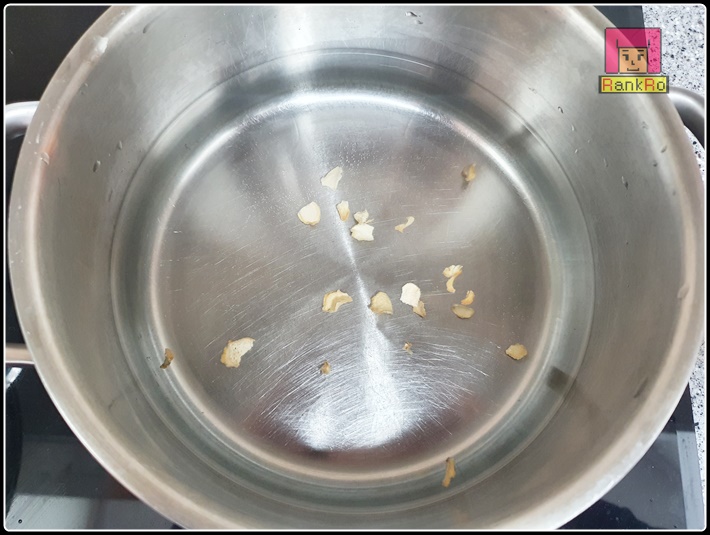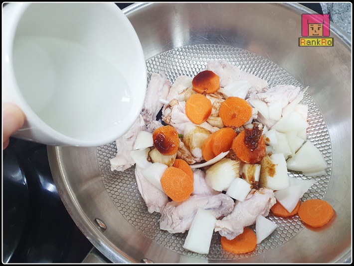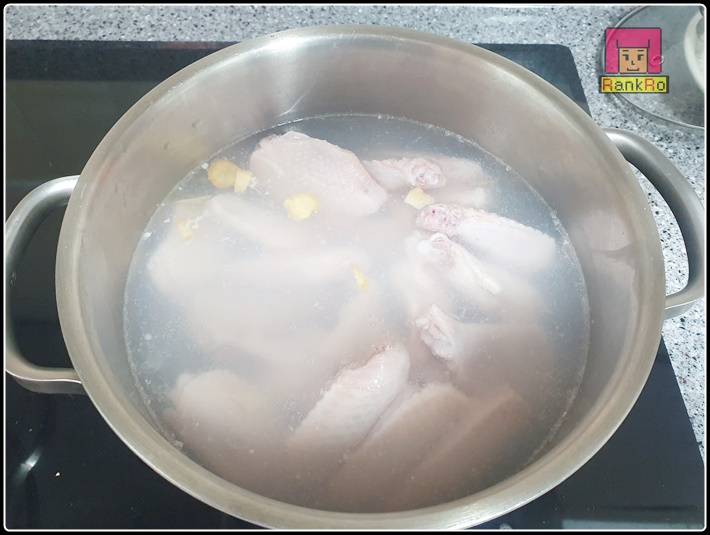 ▼ 냄비에 닭이 가득 담기도록 물을 넣은 후, 잡내를 없애주기 위해서 말린 생강이나 소주, 청주, 미림 중 한 가지 넣어줍니다. (닭 냄새가 심하다면 우유에 30분 정도 담궜다가 빼주신 후에 이 절차를 진행해주시면 됩니다. 우유 숙성으로 닭 특유의 냄새를 어느 정도 잡을 수 있어요.) 음~ 저는 잡내제거를 위해서 물에 말린 생각을 넣었습니다.