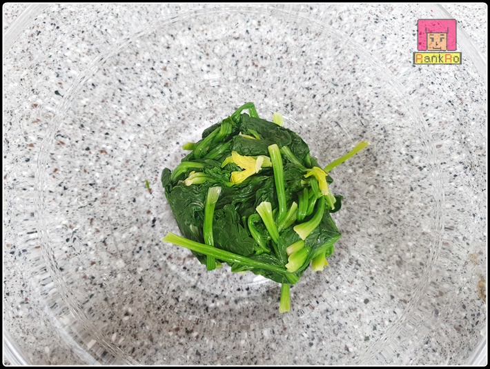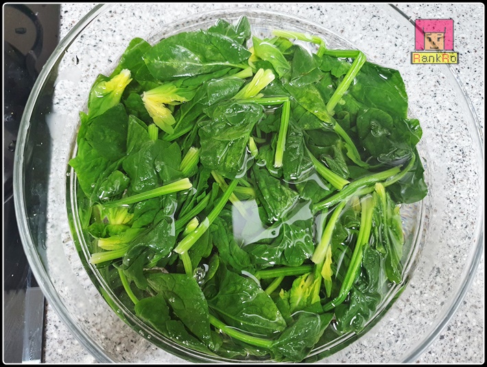 ▼ 시금치를 건져내 차가운 물에 헹궈주세요. 차가운 물로 씻어주면 아삭함이 살아 있답니다. 뜨거운 상태로 유지한다면 식감이 무르기 때문에 차가운물에 헹궈 준비해 주세요.