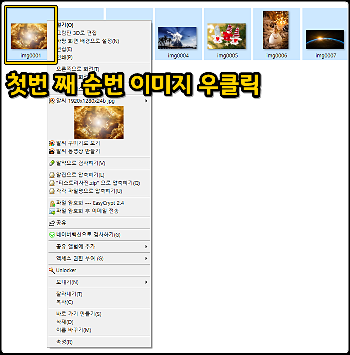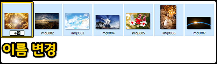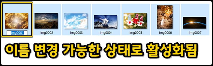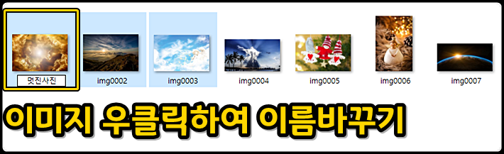 ◆ 참고로, 이미지에 부여할 제목의 순번은 선택한 이미지를 기준으로 오른쪽으로 순서가 정해집니다. 예를 들어 위의 이미지들 중에서 img0001 이미지에서 시작하면 해당 이미지를 기준으로 우측으로 순번이 매겨지는 것입니다. 자세한 내용은 아래에서 다시 설명드릴게요.