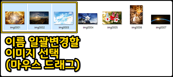 ▼ 이름을 일괄변경할 이미지들을 마우스 드래그를 통하여 정해줍시다. (혹은 Ctrl 키를 누른 상태애서 선택이 필요한 이미지를 좌클릭해주세요.)