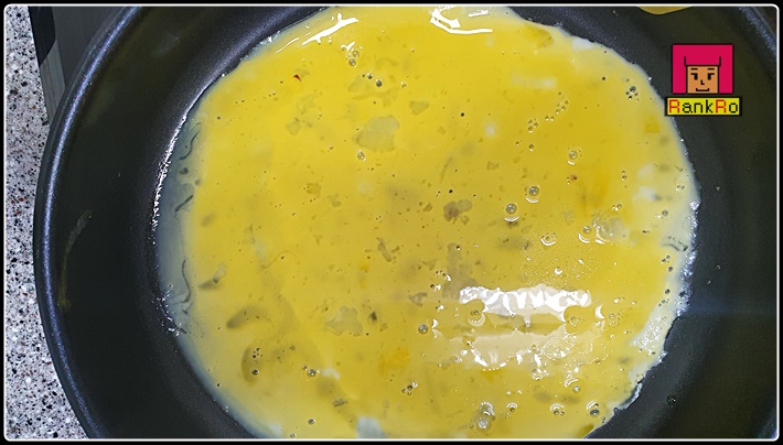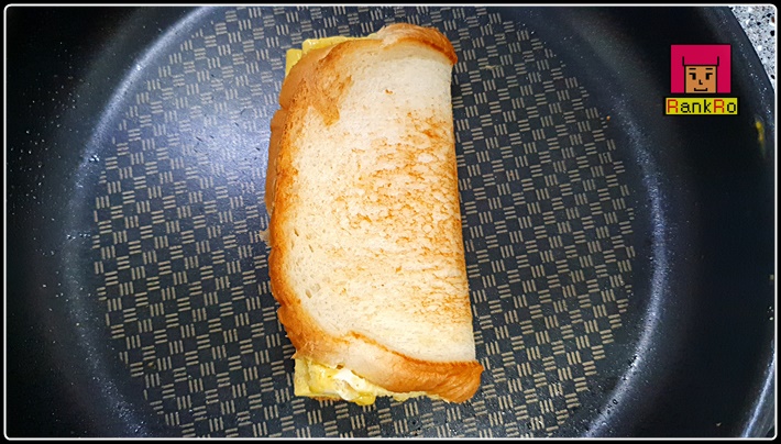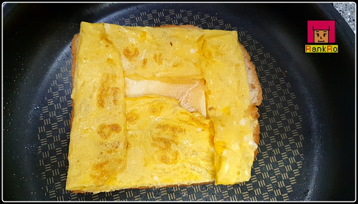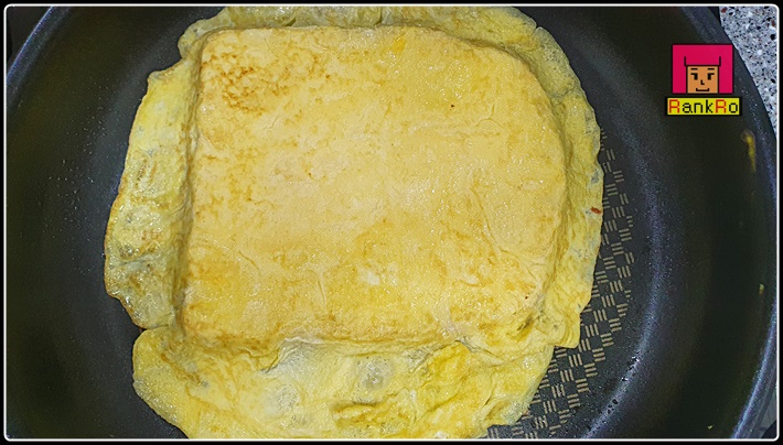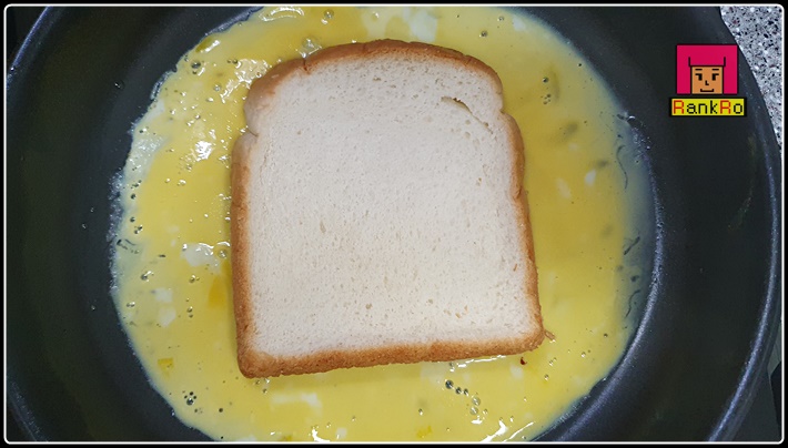 ▼ 프라이팬에 계란물을 넣어주고 아랫면이 조금 익었을때 식빵을 올려주세요. 계란을 도톰하게 드시고 싶다면 계랸양을 더 추가해 주세요.