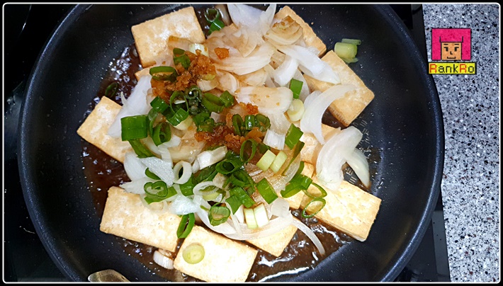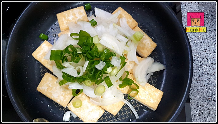 ▼ 단단하고 노릇 노릇하게 만든 두부에 잘라논 양파와 파 그리고 양념장을 넣어 주세요.