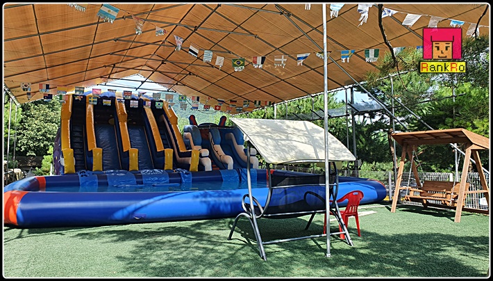 ▼ 캠핑장 안 수영장 모습입니다. 캠지기님께서 아침 일찍부터 운영을 위해 마무리 청소도 하시며 수질관리를 하고 있는 모습도 볼 수 있었습니다. 여름에는 수영장으로 다른계절에는 에어바운스로 운영을 한다고 합니다. 수영장 위에는 해를 막아주는 타프가 설치되어 있어 아이들이 뜨겁지 않게 놀 수 있었습니다. 수영장에 흔들 의자와 일반의자가 준비 되어 있어 아이들이 잠깐 쉴때나 아이들을 지켜보시는 어른들이 쉴 수 있을 것 같네요.