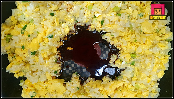 ▼ 이제 밥에 간을 해 줍니다. 팬 가장자리나 가운데에 간장 2큰술 넣어 주시고 살짝 간장이 바르르 끓어 오르게 해 주시면 됩니다. 간장이 끓어 오르면 밥과 함께 잘 섞어 주시면 됩니다. 맛을 보시고 간이 부족하면 소금을 넣어 주시면 됩니다. ( 식당에서 드시던 맛을 느끼시려면 굴소스나 맛소금을 넣어 주시면 됩니다. ) 고슬 고슬한 볶음밥을 위해 밥알이 으깨지지 않게 잘 볶아주세요.