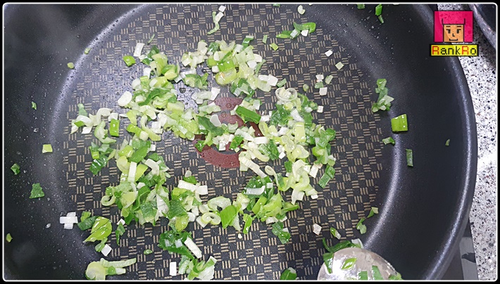 ▼ 여기에 준비된 준비된 파를 넣어 줍니다. 파를 중약불로 볶아 파 향을 내 줍니다. 풍미가 올라 오도록 충분히 볶아 주시면 됩니다. ( 쪽파나 대파는 송송 썰어 준비합니다. 대파는 두께가 두꺼울 경우 세로방향으로 먼저 2등분한 다음 썰어주시면 됩니다. )