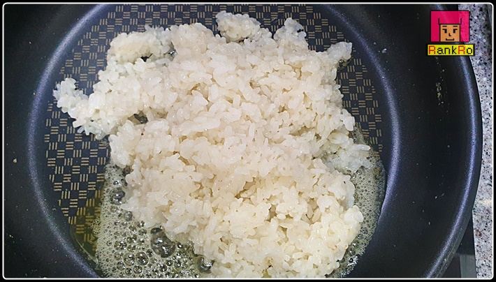 ▼ 버터나 마가린은 타기 쉬우니 버터가 녹았다면 밥을 넣고 볶아 주세요. ( 볶음밥에 들어가는 밥은 찬밥이나 고두밥을 이용 하시면 좋습니다. 찬밥이나 즉석밥을 이용하셔도 됩니다. 고슬고슬한 밥을 사용하시면 계란볶음밥 식감과 고소한 맛이 잘 살아납니다. )