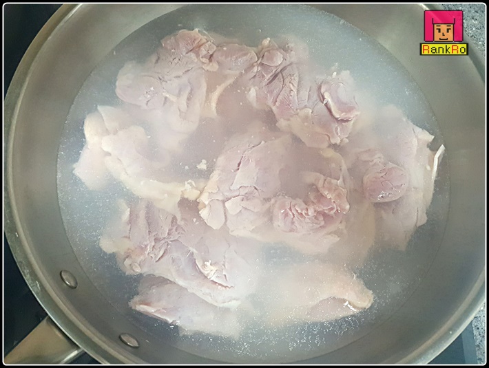 ▼ 큰 냄비나 웍에 물을 넉넉하게 담고 물이 끓으면 닭고기를 3~5분정도 끓여 줍니다. 닭을 넣고 초벌 삶기 해 주시면 됩니다. 이과정을 통해 핏물과 불순물을 어느 정도 제거 할 수 있습니다. 냄새 제거를 위해 소주를 조금 넣었습니다. 잡내가 걱정 되시면 소주나 청주, 미림을 넣어 삶아 주시면 됩니다. 닭다리살로 닭조림을 하실 경우는 우유에 잠시 담궈 두신후 소금과 후추로 밑간을 한 후 사용 하셔도 됩니다.