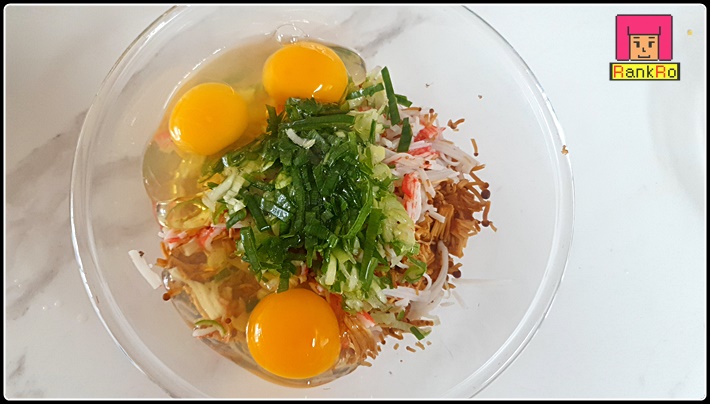 ▼ 넓은 볼에 잘라논 팽이버섯과 크래미, 다져놓은 파를 넣어 주세요. 파를 넣으면 훨씬 향과 맛이 좋아진답니다. 쪽파나 대파를 사용하시면 됩니다.