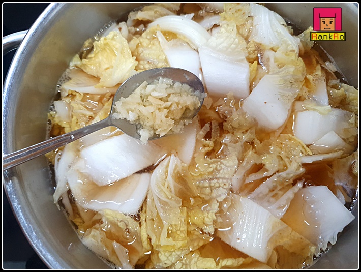 ▼ 배추국이 끓어오르면 다진 마늘 1큰술을 넣어 주세요.