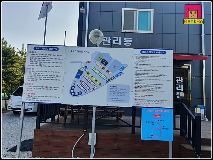 ▼ 로하스 캠핑장 배치도입니다. 로하스캠핑장은 고라니존, 두가족존, 참게존, 반딧불이존, 두루미존, 데크존, 타프존, 세미글램핑 으로 되어 있습니다. 어느 사이트를 선택하셔도 캠핑장이 크지 않아 편의시설 이동이 편리한 것 같아요. 대부분 파쇄석으로 되어 있으며 관리동 옆으로 주차장으로 쓰이는 공터에 주차하시면 됩니다.