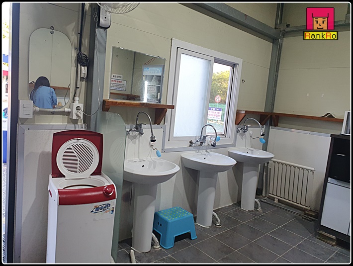 ▼ 로하스캠핑장 개수대 입구와 내부 모습입니다. 내부는 깔끔하게 되어 있으며 개수대도 넉넉하게 있어 복잡하지 않고 사용하기 불편함이 없었네요. 개수대 내부에는 간단하게 세수나 양치할 때 사용할 세면대가 있고 공용 냉장고도 있어 상하기 쉬운 음식물을 보관하시면 되고, 생수나 음료 등은 보관이 불가능합니다. 전자레인지도 2대나 구비되어 있습니다.