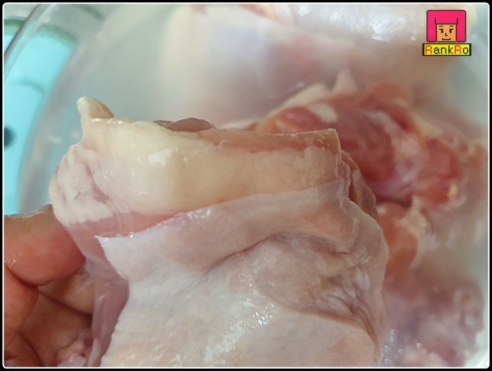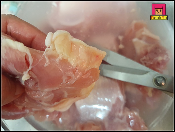 ▼ 닭에 붙어 있는 흰색이나 노란색 기름은 가위로 제거해 주세요. 흐르는 물에 여러 번 씻어 주시면 됩니다. ( 잡내 제거를 위해 우유에 담가 놓으면 잡내 제거에 도움이 됩니다. )