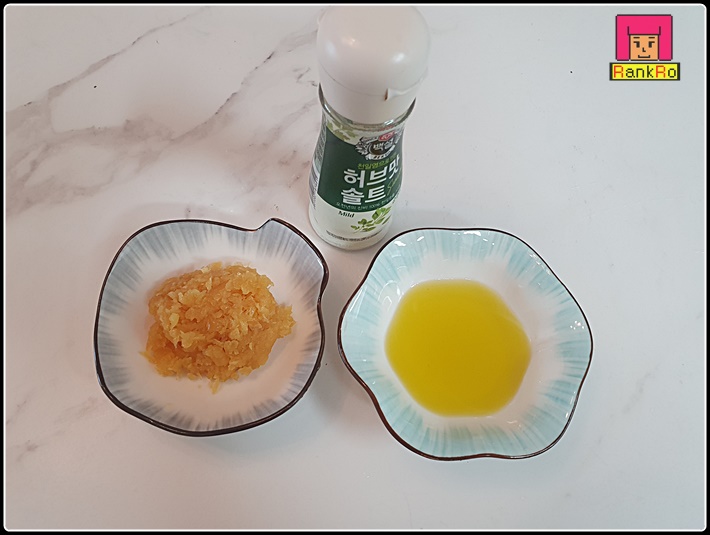 ▼ 닭다리살 에어프라이어 요리에 들어가는 마늘1큰술과, 올리브 오일 2큰술, 허브솔트를 준비해 주세요