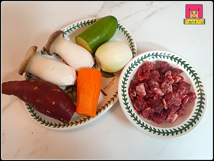소고기 200g, 양파 1개, 당근 1/2개, 새송이버섯 2개, 호박 1/2개, 고구마 1개, 식용유 2큰술,