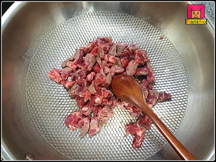▼ 예열된 둥근 팬에 식용유를 두 큰 술 넉넉하게 두르고 고기를 먼저 넣어 볶아주세요. 3분 정도 중불에서 충분히 볶아 주세요.
