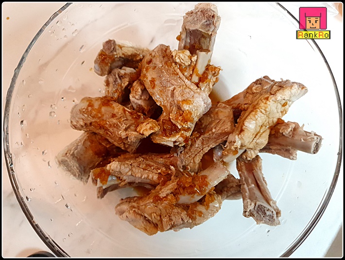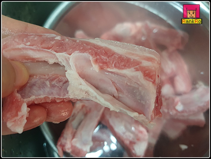 ▼ 등갈비 잡내 제거를 위해 물에 담가 핏물을 빼 주세요.( 찬물에 설탕 1큰술을 넣어주면 핏물 빼는 시간을 조금 단축할 수 있습니다. ) 등갈비 안쪽 근막을 제거해 주시면 됩니다. 근막이 제거되지 않으면 식감이 질겨지기 때문에 제거해 주시고 지방이 많이 붙어 있다면 떼어내주세요. 20~30분 정도 담가 핏물을 빼주신 후 뼈의 절단면에 뼛가루가 남아있으니 깨끗하게 닦아 주신 후 체에 밭쳐 물기를 빼 주세요.