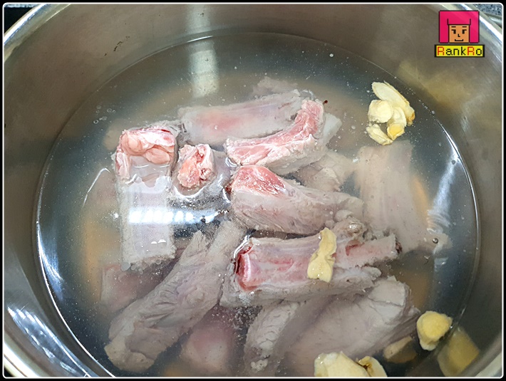 ▼ 끓는 물에 등갈비를 넣어 주세요. 10~15분 정도 중불과 강불 사이로 삶아 주시면 됩니다. (삶아 주시면 불순물과 잡내 제거도 되며, 육질이 부드럽고 깔끔한 돼지 등갈비 구이를 만들 수 있습니다. )