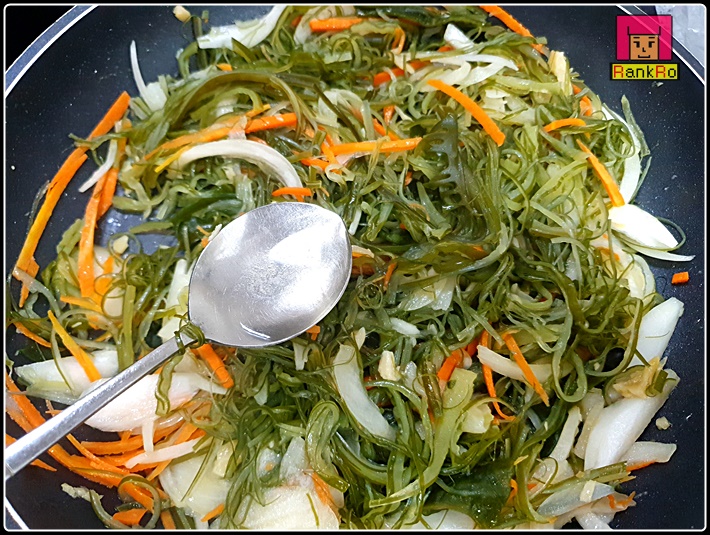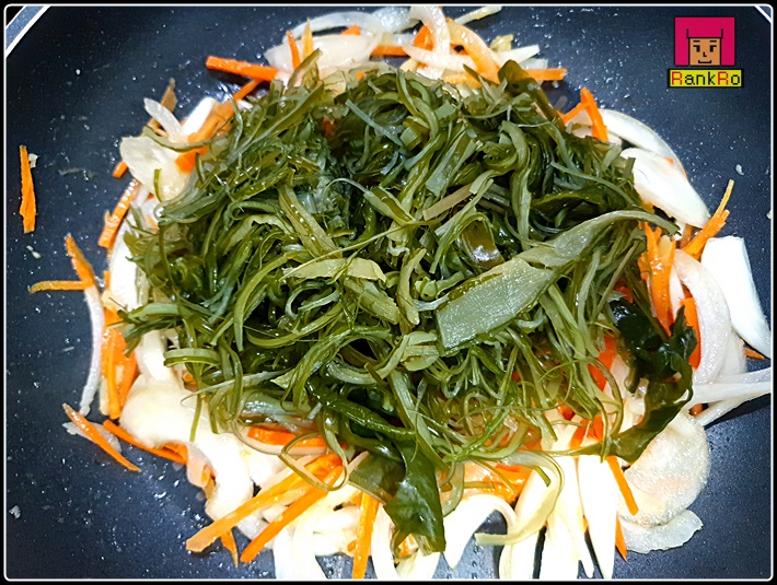 ▼ 당근과 양파가 잘 볶아졌다면 잘라서 준비해둔 미역 줄거리를 넣어 주시고 볶아주세요.