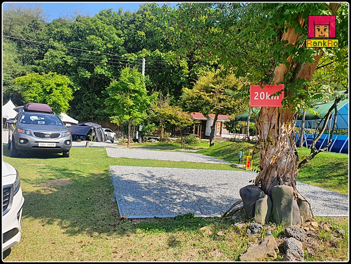 ▼ 관리동 바로 옆으로 수영장 아래 A존 사이트입니다. 사이트는 파쇄석이며 사이트와 사이트 사이는 잔디로 되어 있습니다. 아이들이 있다면 화장실, 개수대, 수영장, 방방장이 가까운 구역입니다. 조금은 시끄러울 수 있을 것 같았지만 아이가 있다면 시설이 가까운 곳이 좋을 것 같고, 잔디가 있어 더 초록 초록한 느낌이 드네요.