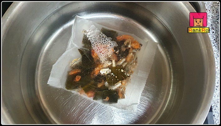 ▼ 감자국 멸치육수를 만들어 주세요.( 넉넉한 냄비에 멸치한줌과 다시마1~2장을 물1L~1.5L를 넣고 8~10분정도 끓여주시면 육수가 만들어 집니다. ) 저는 멸치다시육수팩을 이용해 멸시다시마육수를 만들었습니다.
