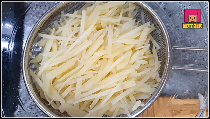 ▼ 데친 후에는 찬물에 살짝 헹궈내고 채반에 올려 물기를 빼 주세요. 데친 후 그대로 두면 여열로 감자가 더 익거나 전분으로 인해 감자채가 서로 들러 붙을 수 있으니 살짝 헹궈내 주세요.