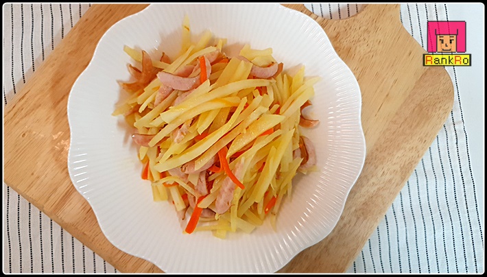 ▼ 고소한 감자볶음 만드는법 완성입니다. 고소한 감자채볶음과 짭짤한 소시지가 더해져서 아이들 반찬으로 만들어 먹기 좋은 감자채볶음 반찬이 되었습니다.