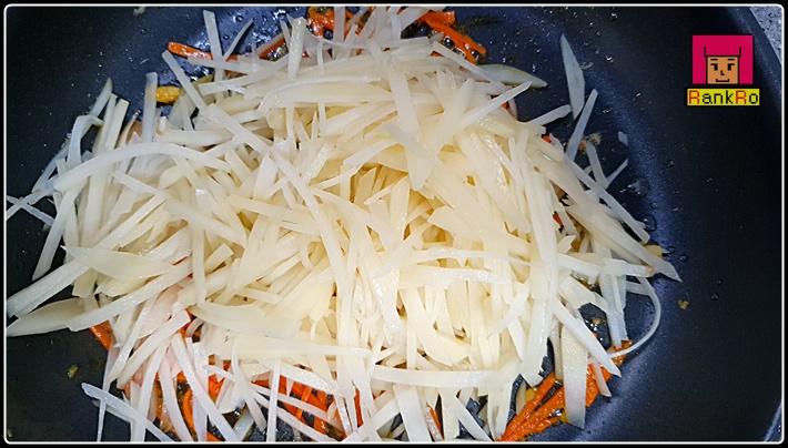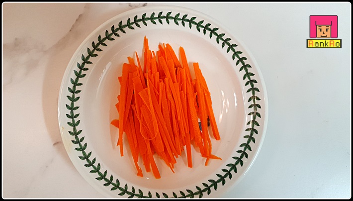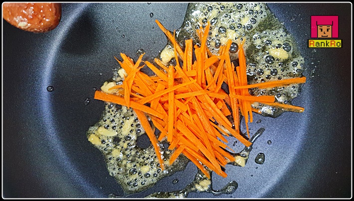 ▼ 고소한 마늘향이 올라오면 가늘게 채 썰어논 당근채를 넣어 볶아주세요.
