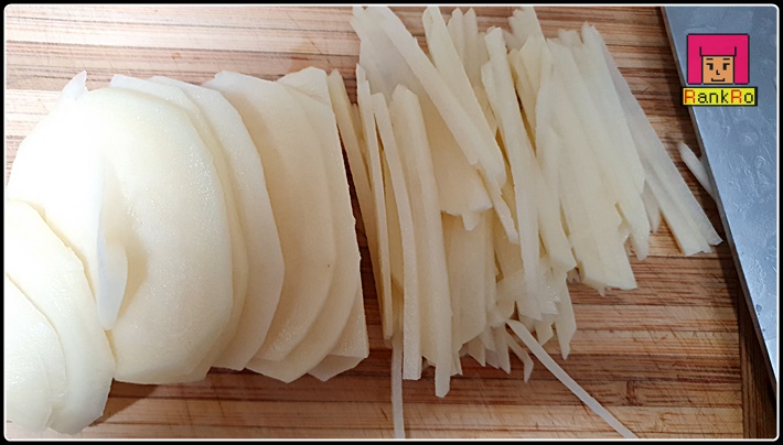 ▼ 너무 얇거나 굵지 않게 잘라 채 썰어 줍니다. 한번 끓는 물에 데쳐서 사용할 감자니 너무 얇게만 썰지 않으시면 됩니다.