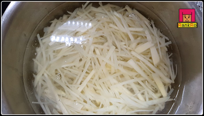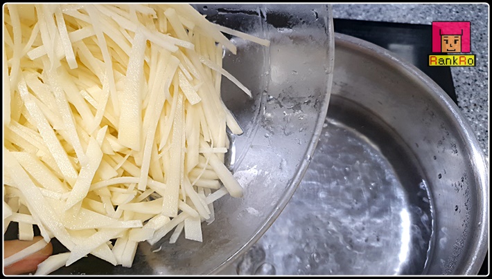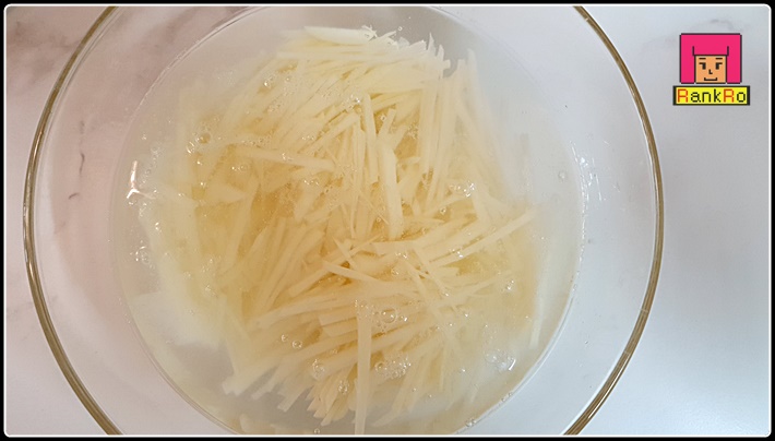 ▼ 부서지지 않게 감자볶음 만드는법에는 감자채를 물에 한번 헹군 뒤 볼에 물을 담아 전분기를 빼주면 감자볶음을 만들 때 감자 전분으로 감자볶음이 엉겨 붙거나 눌어붙지 않고 쉽게 부서지지 않아요.