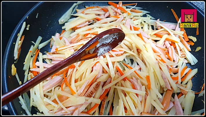 ▼ 데친 감자채라 부드럽기 때문에 너무 휘휘 저으면 부서질 수 있으니 가볍게 천천히 저으면서 볶아줍니다. 이때 타지 않게 잘 저어가면서 볶아주세요.