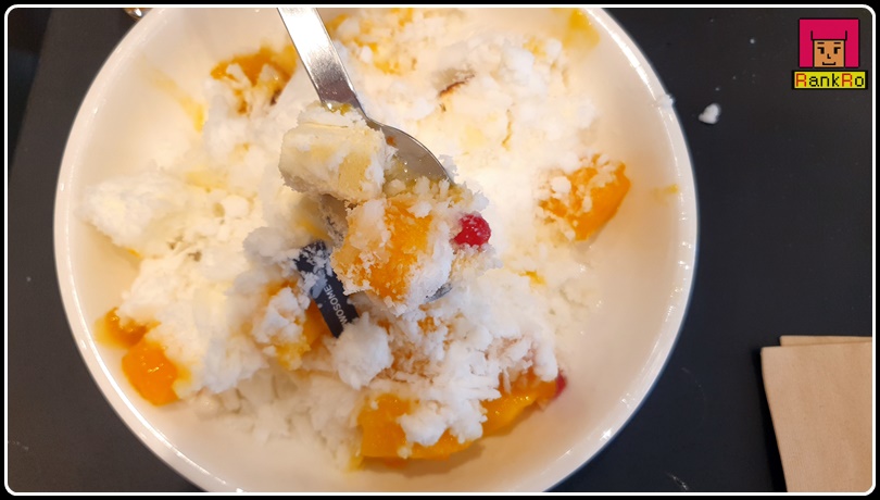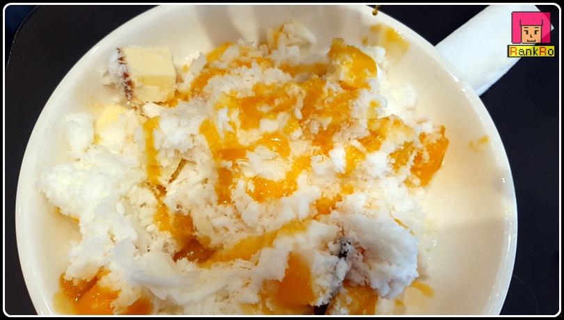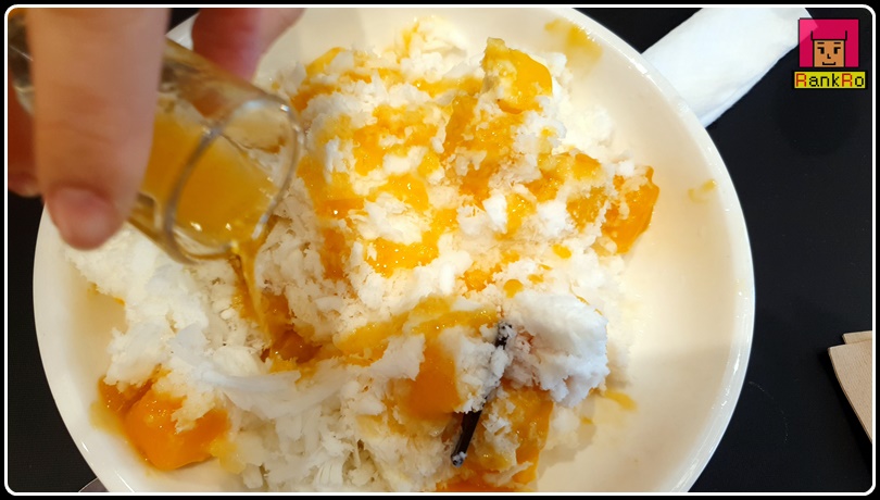 ▼ 망고시럽은 취향에 따라 뿌려도 그냥 드셔도 될 것 같아요. 저는 달달한 망고빙수를 좋아해서 골고루 시럽을 뿌려 넣었습니다.