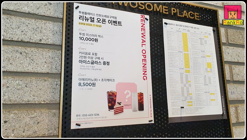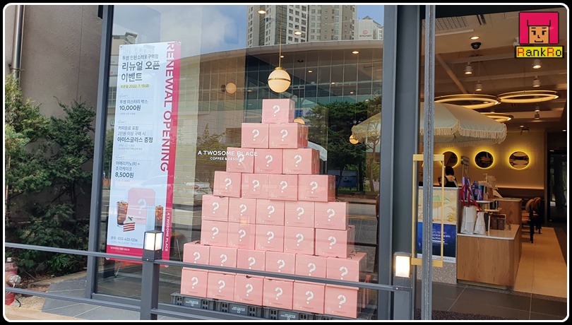 ▼ 리뉴얼 오픈이벤트로 투썸 미스터리 박스가 100개 한정으로 매장 안에 준비되어 있었으며, 커피음료 포함 2만 원 이상 구매 시 아이스 글라스 증정과 아메리카노(R)+조칵케이크를 8500원 행사를 7월 15일 ~ 7.31일까지 진행한다고 해요. 시간 되시면 소래포구역점 투썸플레이스에 들려 보시는 것도 좋을 것 같아요. 저도 미스터리 박스 하나 구매해 보았습니다. 미스터리 박스 안 내용물이 궁금하시죠? 개봉 사진은 글 아래 내리시면 볼 수 있습니다.