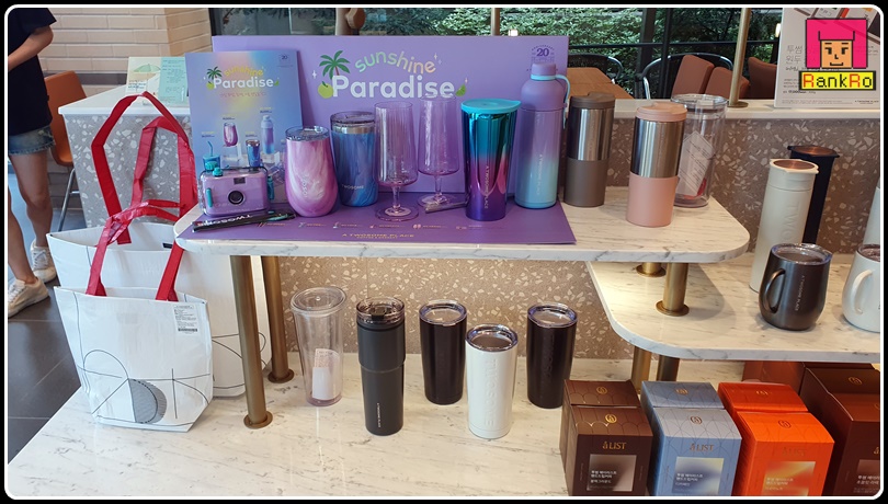 ▼ 리뉴얼 오픈이벤트로 텀블러나 여러가지 상품들 구경하는 사람들도 많아져 저도 사진 찍으며 볼 수 있었네요. 2022 여름 MD시즌 상품으로 보라색 컬러의 컵, 색이 참 예쁜 텀블러와 예쁜 필름 카메라~ 색이 청량하면서 여름에 잘 어울리는 예쁜 투썸 20주년 상품들도 만나볼 수 있었습니다. 귀여운 필름 카메라는 아이가 사달라고 해서 사려 했는데 바로 남자분이 사가시더라고요~ 아쉽지만 다음에 더 예쁜 상품으로 사기로 했답니다. 페트병을 재활용해 만든 리유저블 백도 볼 수 있었어요~ 살짝 들어보니 튼튼하면서 여름에 사용하기 좋을 것 같아요~