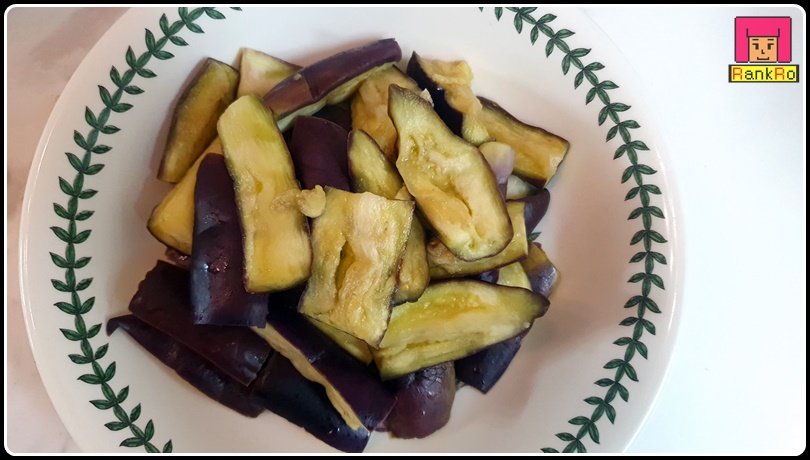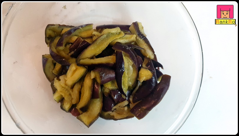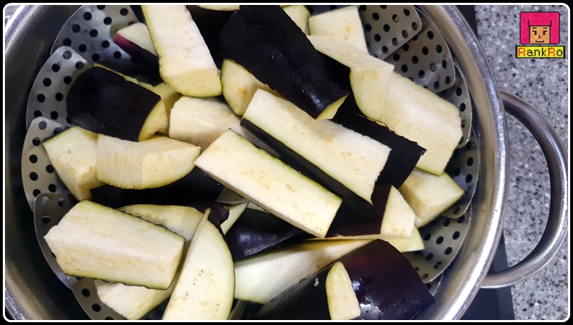 ▼ 냄비에 물을 500ml 붓고 물이 끓어오르면 찜기에 잘라놓은 가지를 올려 주세요. 뚜껑을 덮고 센 불에서 4~5분 정도 찜기에 강불에서 중불로 조절해 쪄 주면 됩니다. 가지의 양에 따라 시간 조절이 달라질 수 있으니 가지의 양에 따라 조절해 주세요. 가지는 너무 오래 찌게 되면 가지가 너무 물러져 물컹해지고 덜 찌면 가지 살이 퍽퍽하니 살짝 젓가락으로 찔러보시거나 손으로 만져보신 후 꺼내 주시면 됩니다.