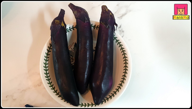 ▼ 가지요리 가지무침에 들어가는 가지 3개를 준비합니다. 가지를 고르실 때는 손으로 들었을 때 묵직하면서 마르지 않고 꼭지 부분이 보랏빛을 띠면서 단단하거나 길쭉하면서 둥글 거리고 전체적으로 보라색을 띠는 가지를 고르시면 됩니다. 가지 꼭지 부분에는 가시가 많이 있으니 가시에 찔리지 않도록 조심하세요.