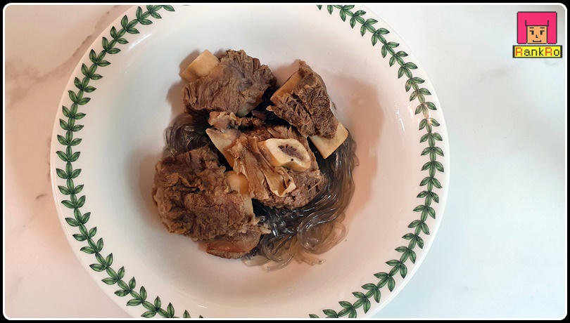 ▼ 먼저 삶아놓은 당면을 그릇에 담고 갈비탕의 갈빗대도 먹기 좋게 담아 준비합니다.