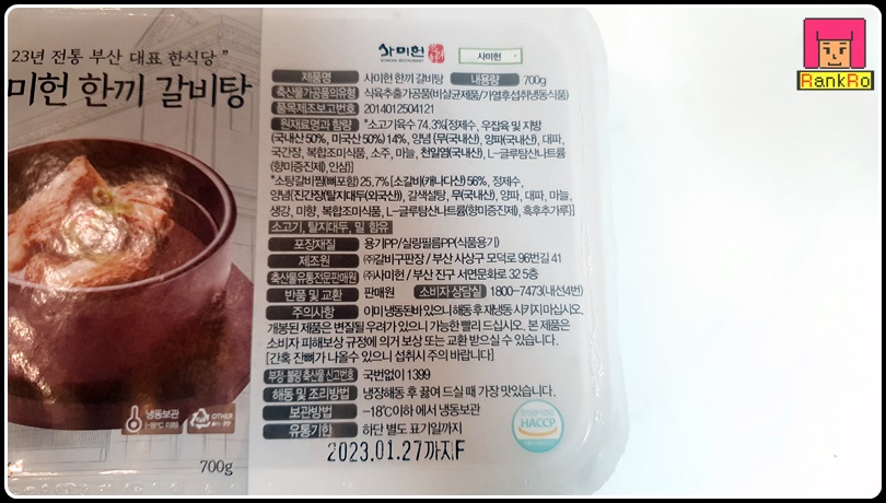 ▼ 사미헌갈비탕의 소고기육수는 국내산 50%, 미국산50%이며, 소탕갈비는 30%가 조금 안되는 양으로 정말 한끼로 먹을 수 있는 갈비양이네요. 냉동식품이라 유통기한도 긴 사미헌 갈비탕입니다.