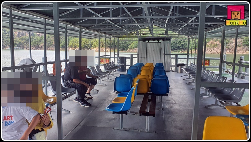 ▼ 바다가 아닌 육지에서 대형 유람선을 탈 수 있다는 것이 충주호 유람선의 매력인 것 같아요. 단양 장회나루 선착장에 앉아 유람선을 기다리면서 사진도 찍어 보았습니다.