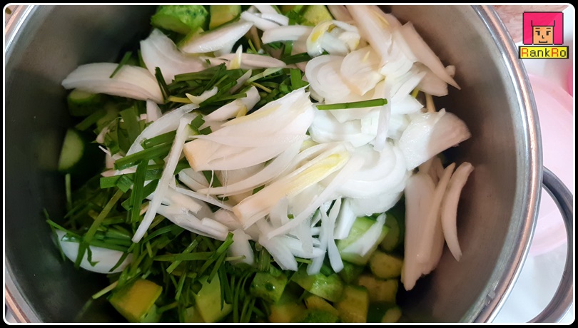 ▼ 물기를 제거한 오이와 준비된 부추와 양파를 모두 넣어 주세요. 만들어 논 양념장을 2/3만 우선 넣고 버무려주세요. 입맛에 맞게 양념장은 가감해 주세요.