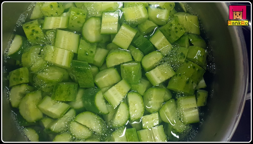 ▼ 손질한 오이에 끓여놓은 소금물을 부어 주세요. 뜨거운 상태의 소금물을 부어 30분간 절여 줍니다.